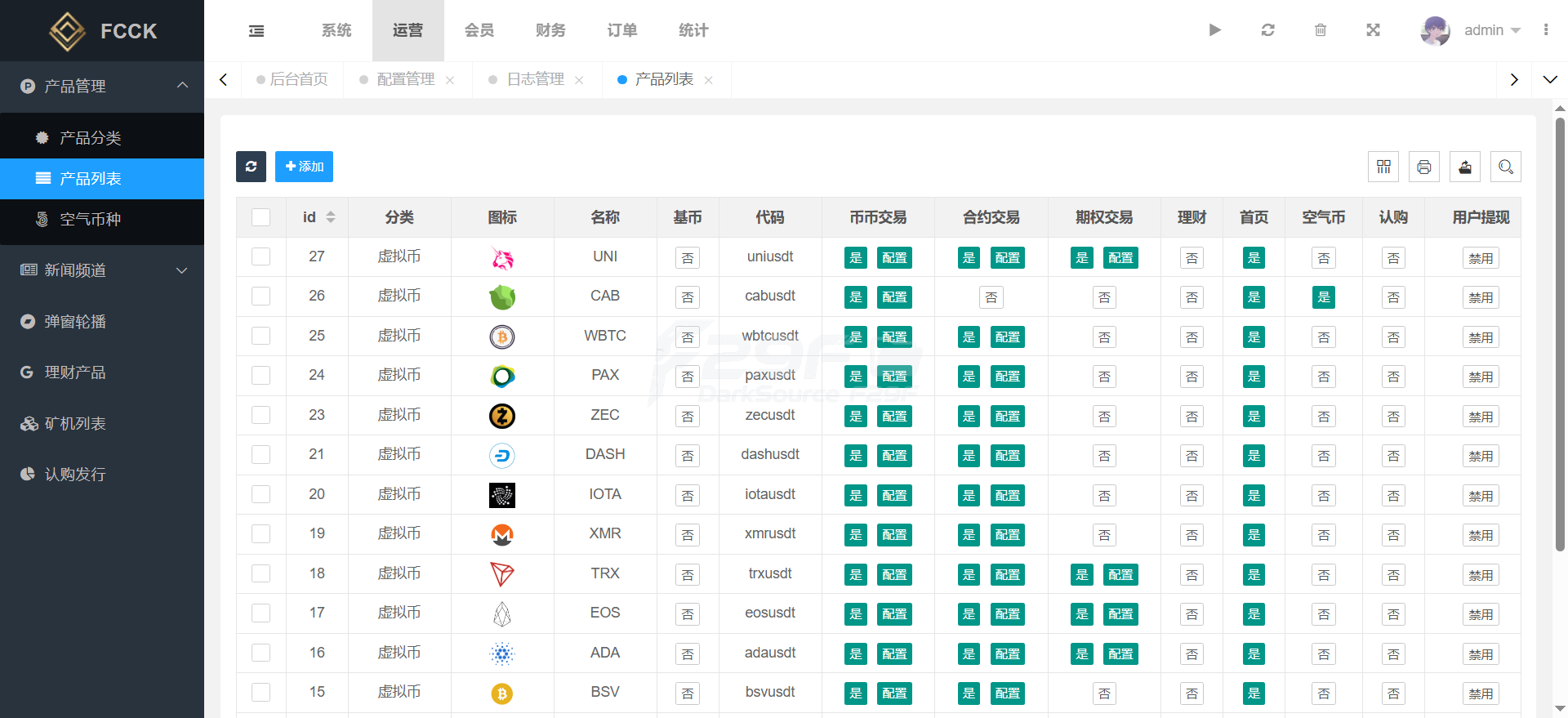 有币币交易、期权交易、永续合约、Defi借贷、新币申购、矿机投资理财等功能,还可以发行空气币(平台币),后台能控制期权交易订单的输赢