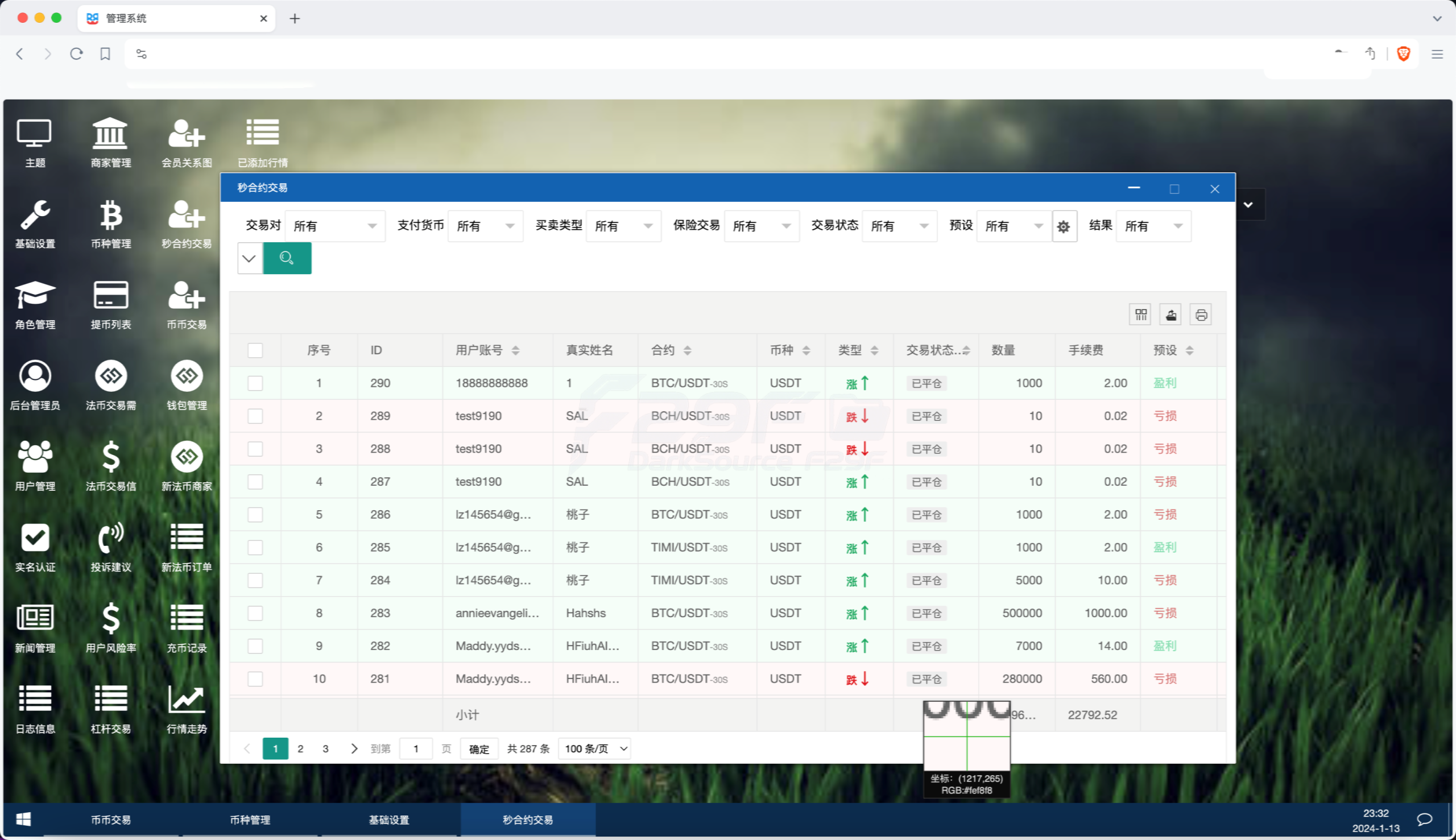 1、平台概况(实时行情、高端K线、合约交易、BI数据分析、币种统计、用户统计、交易统计、异常用户)
