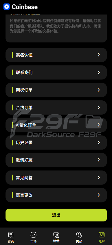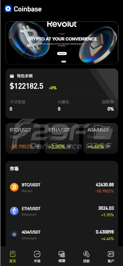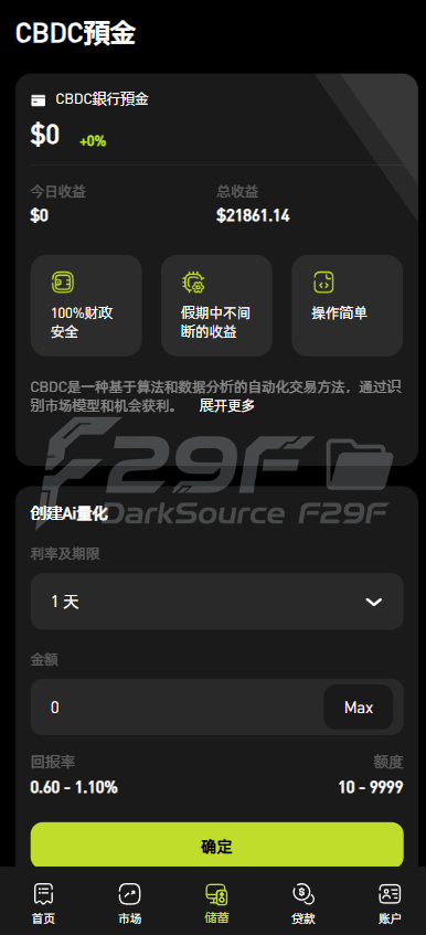 系统底部设有 “首页”“市场”“储蓄”“账户” 等导航栏,方便用户在不同功能板块间切换,如 “市场” 板块可查看各类金融产品行情,“储蓄” 板块涉及 AI 量化和 CBDC 预金,“账户” 板块管理钱包和资金操作。