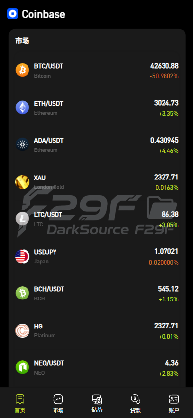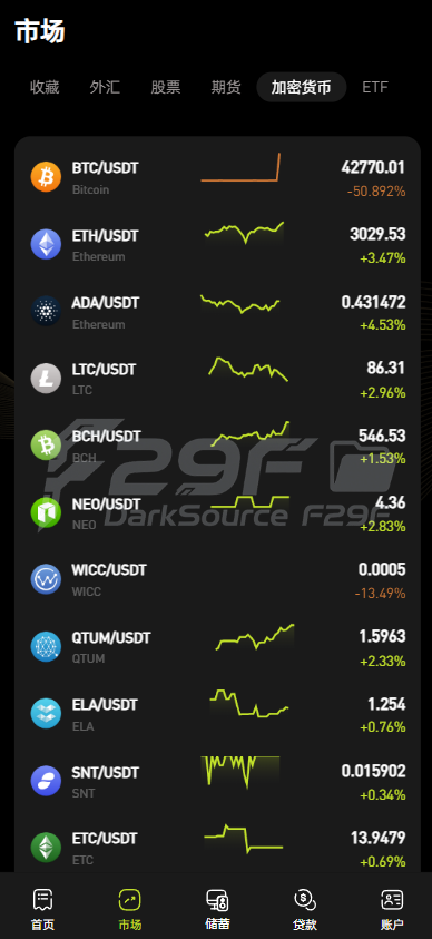 加密货币:支持(BTC)、(ETH)、ADA、LTC)等多种主流加密货币交易,可查看实时价格(如 BTC/USDT 价格波动)、涨跌幅度(绿色表示上涨、橙色表示下跌)及 K 线走势(如 BTC 的分时 K 线图,包含开盘、收盘价格,还可切换 1 分钟、5 分钟等不同时间周期)。