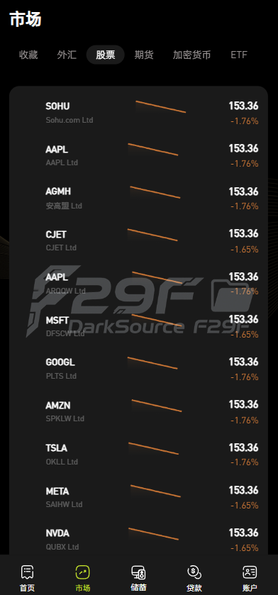 股票:涵盖搜狐(SOHU)、苹果(AAPL)、微软(MSFT)、谷歌(GOOGL)、亚马逊(AMZN)、Meta 等知名企业股票,显示股票代码、公司名称及涨跌幅(如 AAPL 上涨 3.20%)。