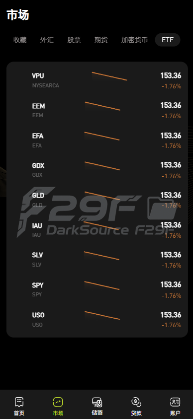 ETF:包含 VPU、EEM、EFA、GDX 等 ETF 产品,同样展示价格和涨跌情况(如 VPU 上涨 0.54%)。
